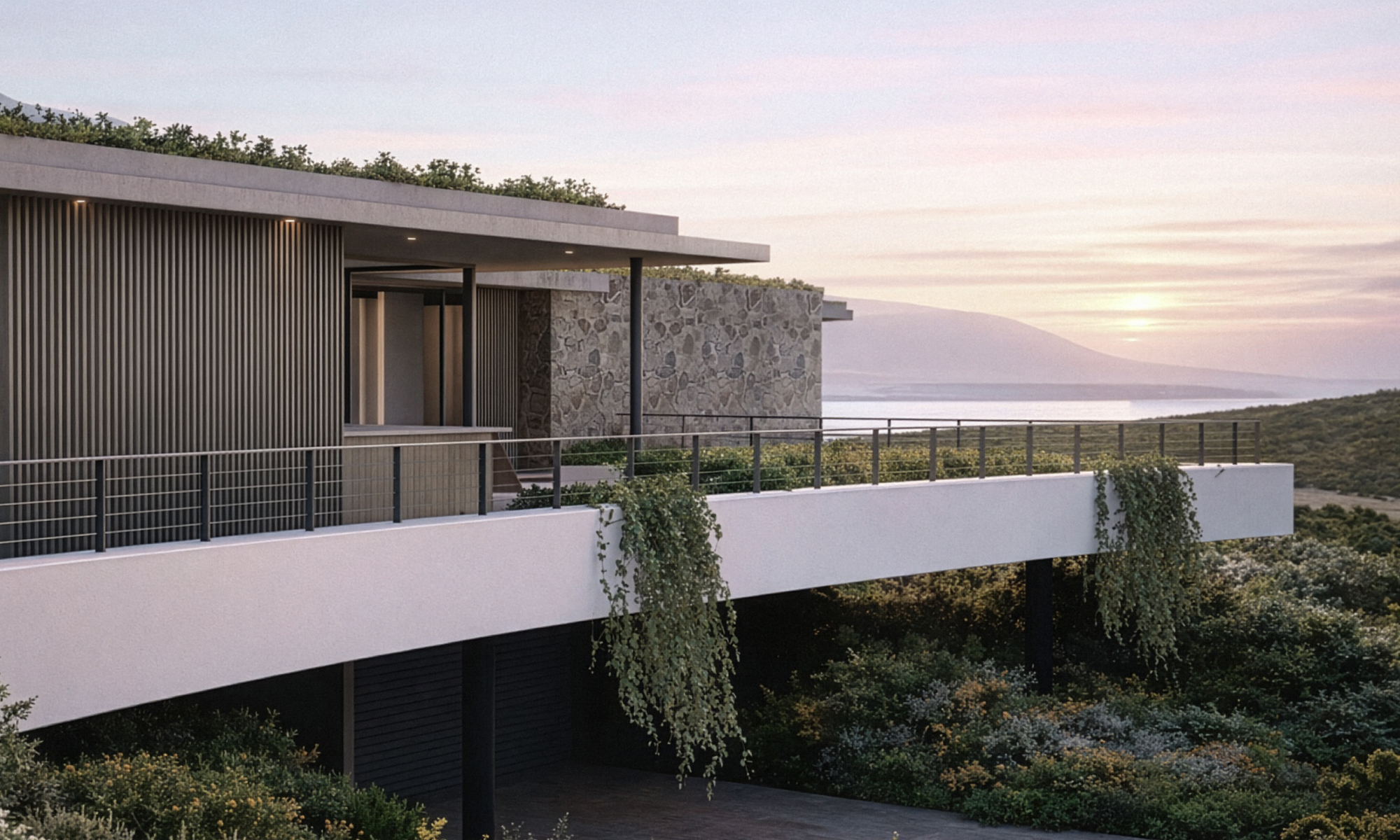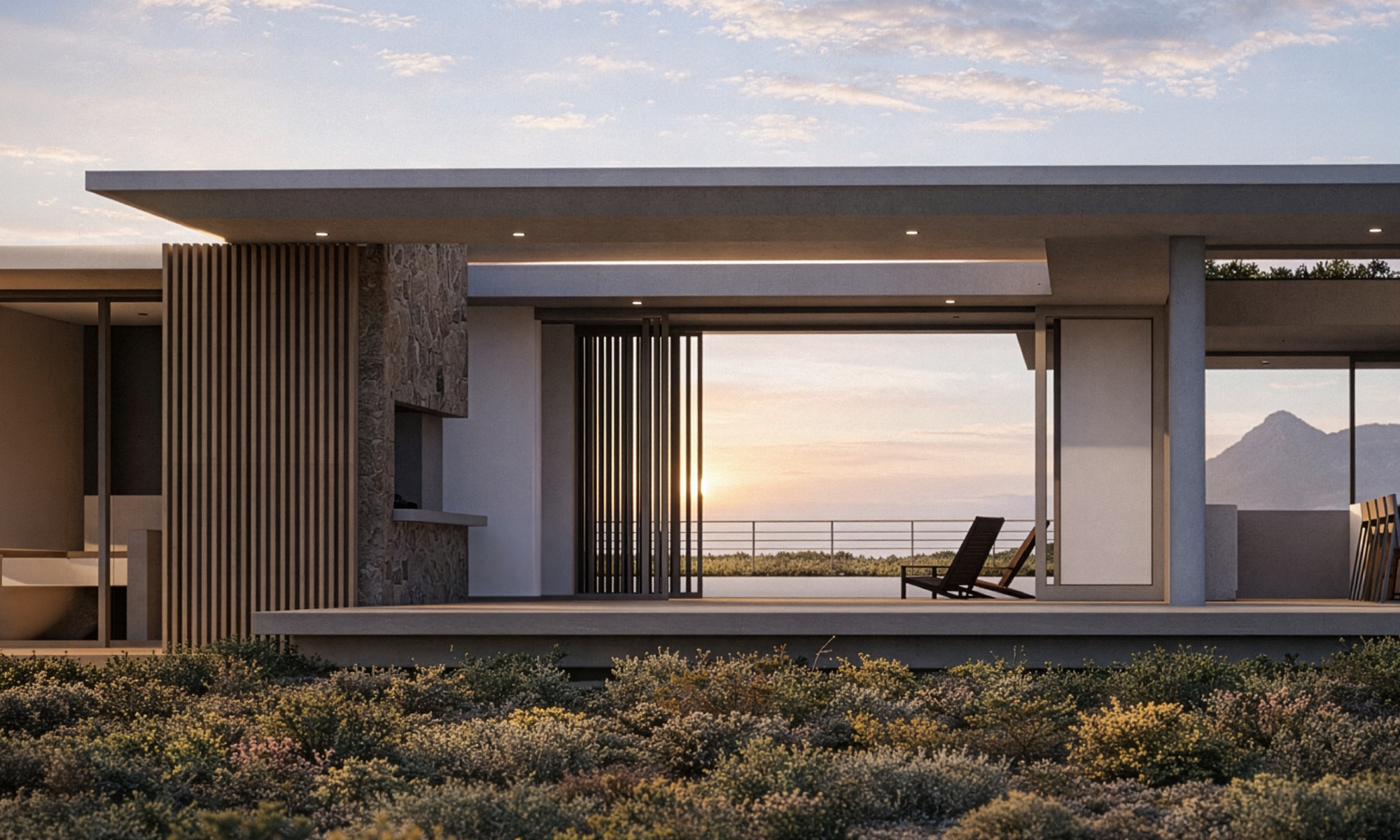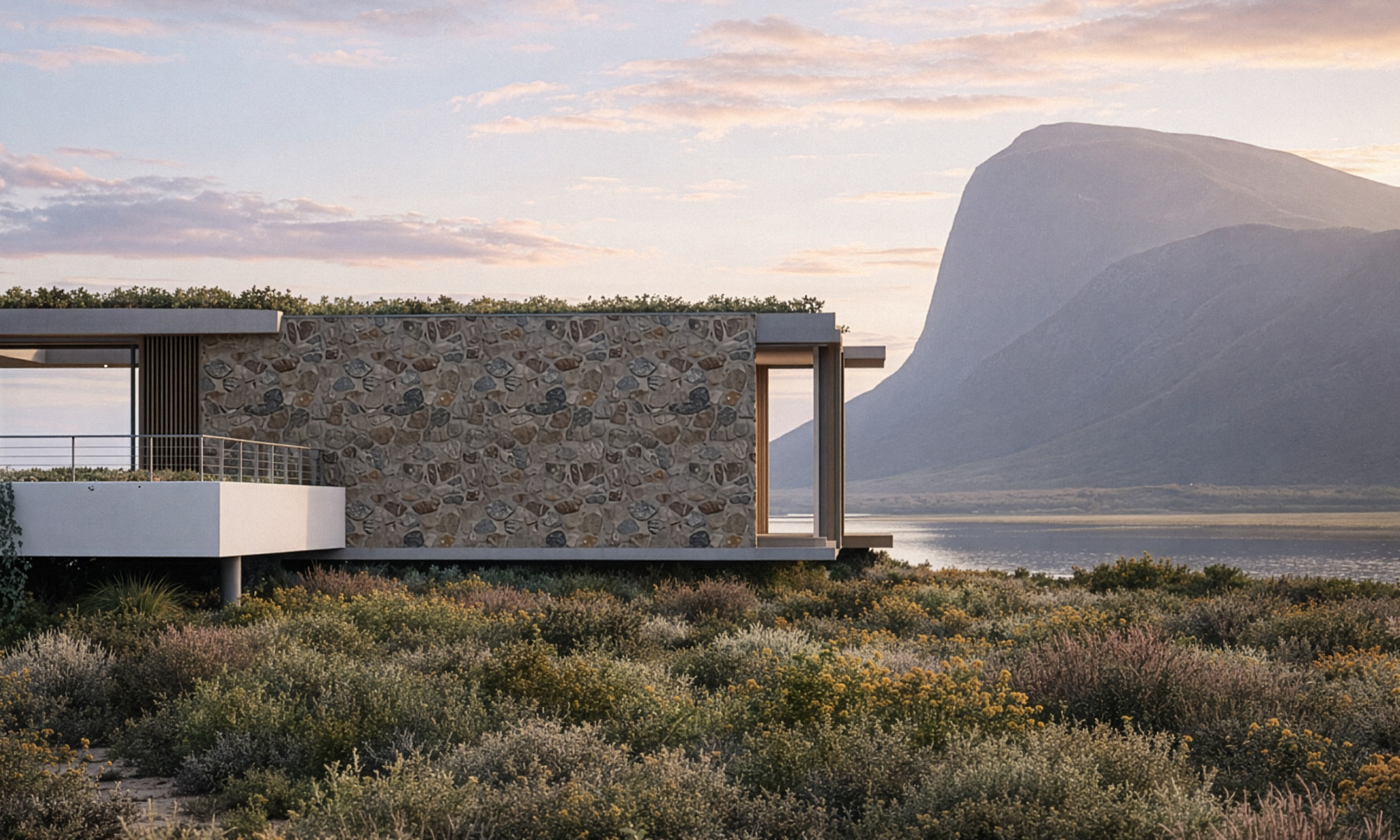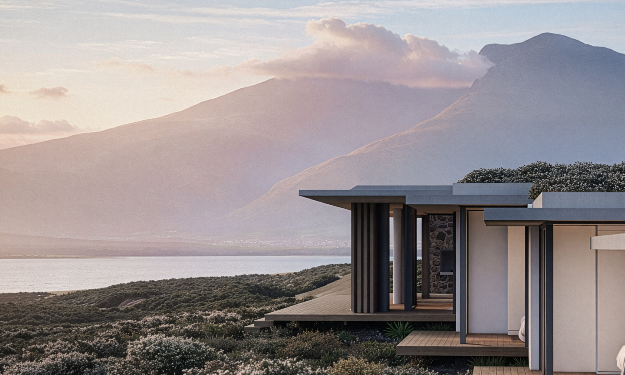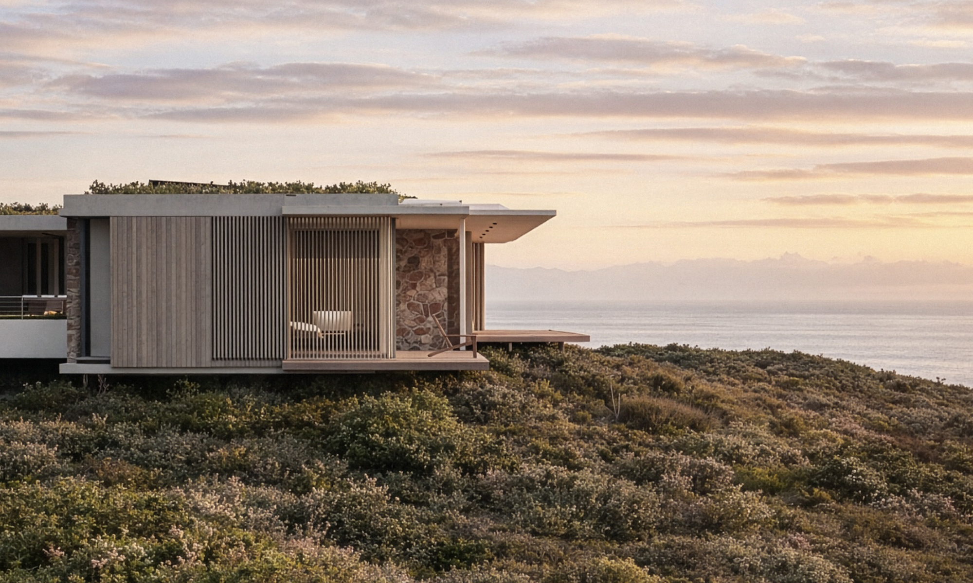 Sea Farm Estate called for an integrated response to its extraordinary setting, where the Hangklip Mountains meet the ocean horizon. The architecture nestles into the landscape, remaining humble against the scale and drama of its surroundings.