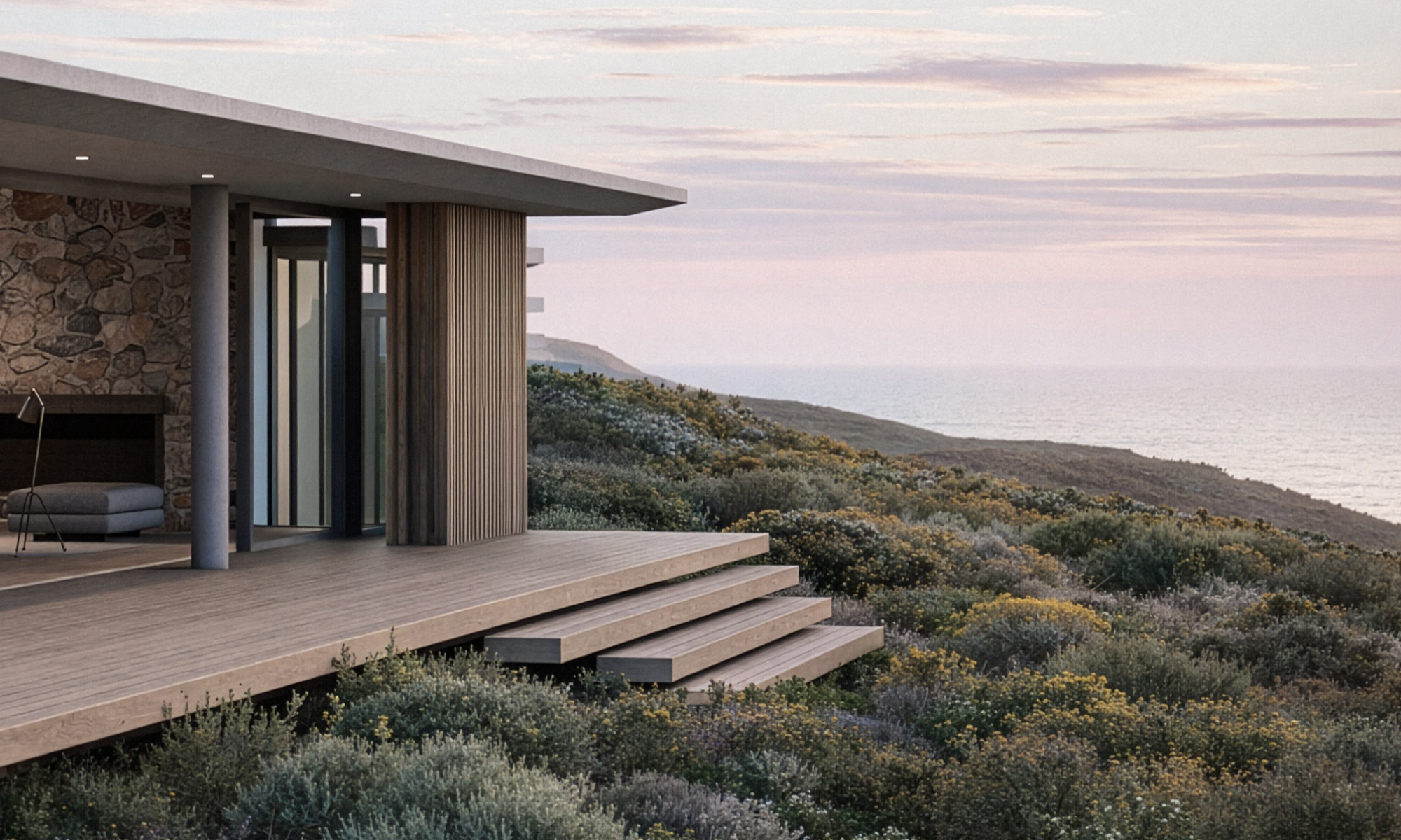Inside, living areas are conceived as protected retreats — calm and inwardly focused — while maintaining a continuous connection to the coastal landscape beyond. The result is a dwelling shaped as much by climate and topography as by architecture.