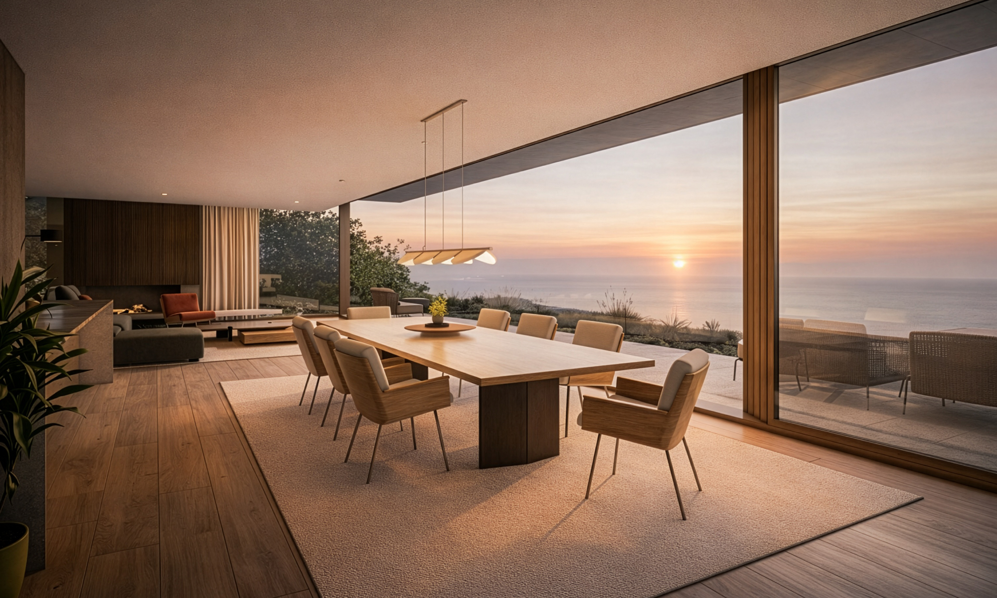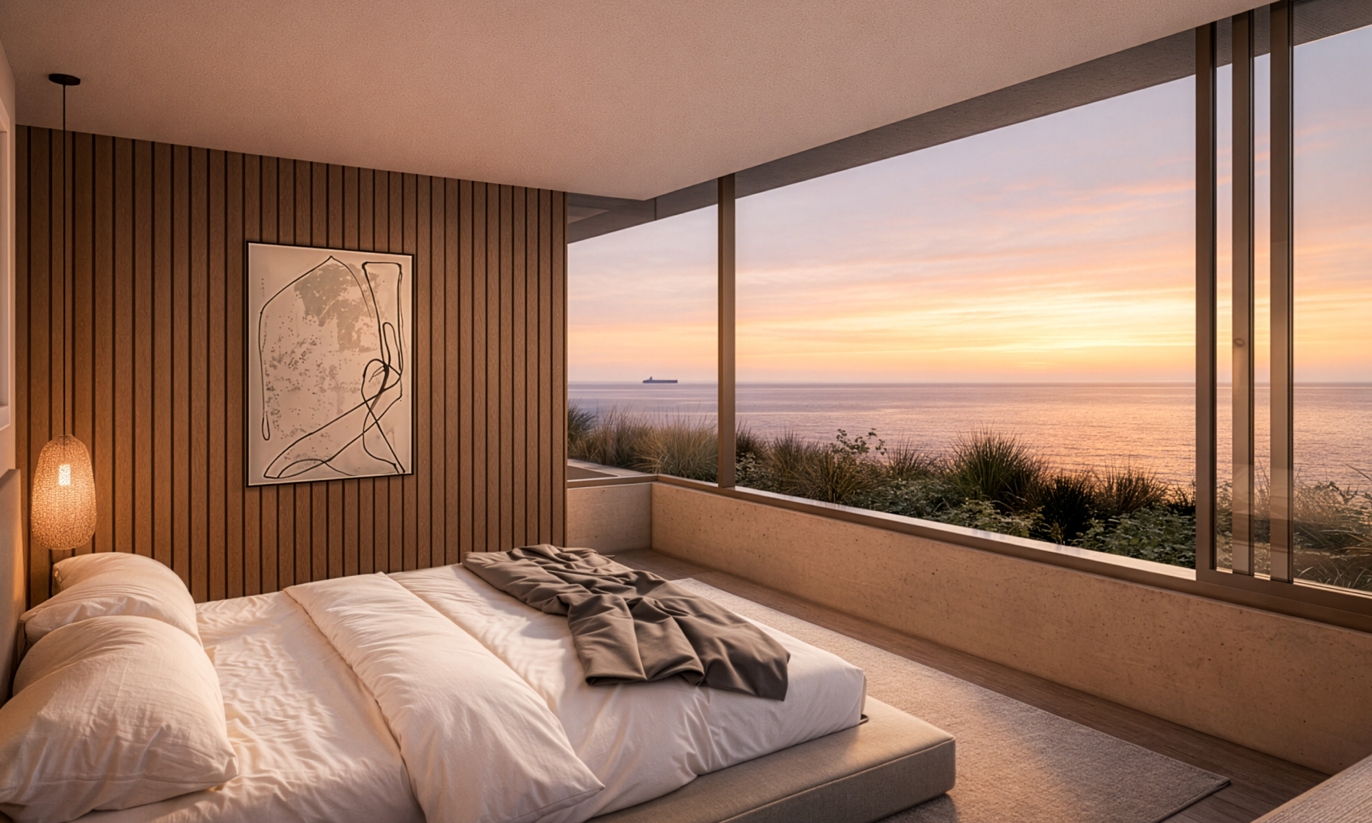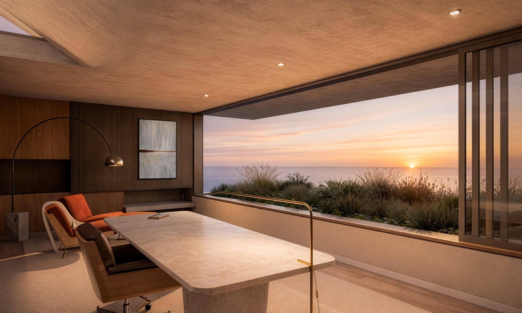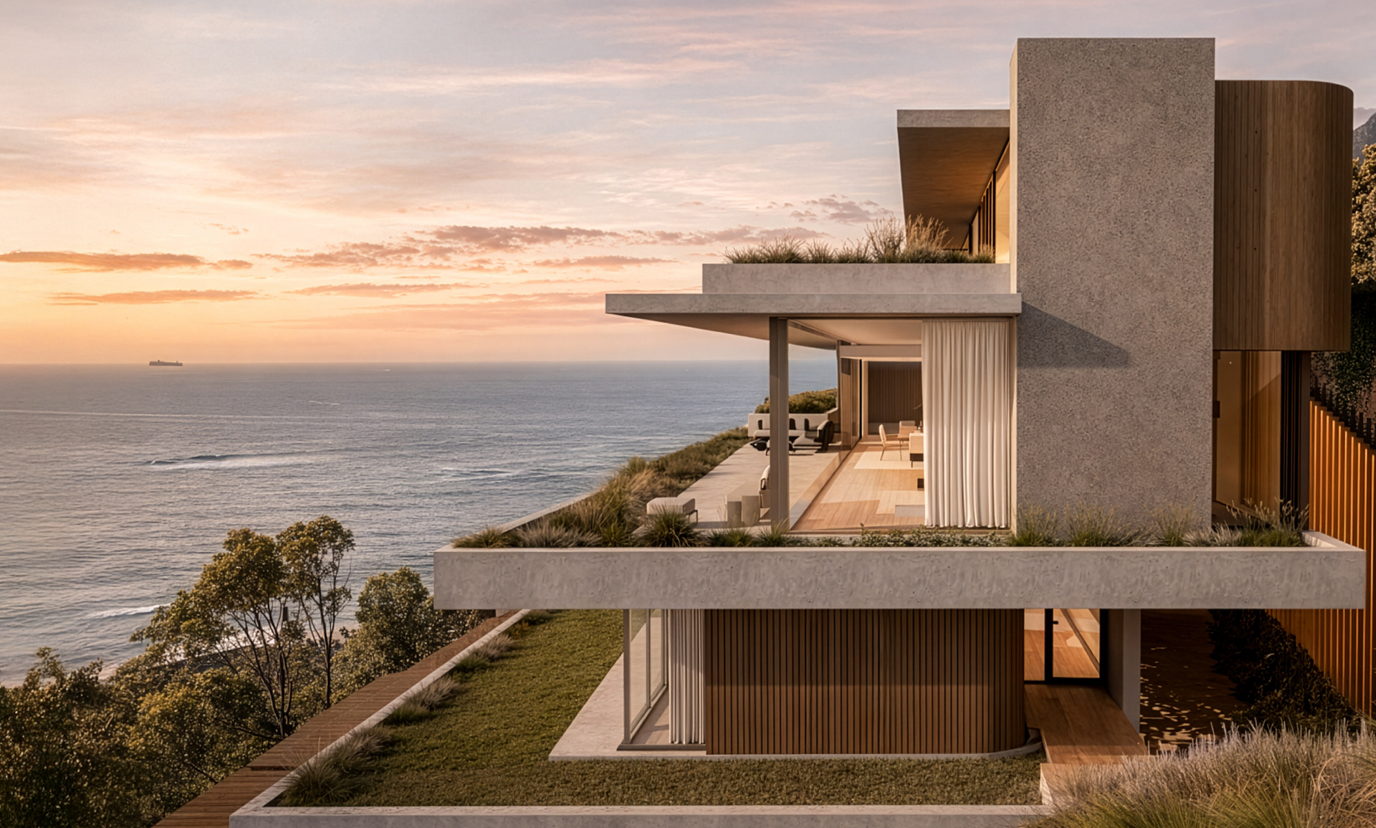 Natural materials, strong horizontal datum lines, and integrated landscaping ground the house within its dramatic coastal terrain — allowing it to sit confidently yet quietly within the slope.