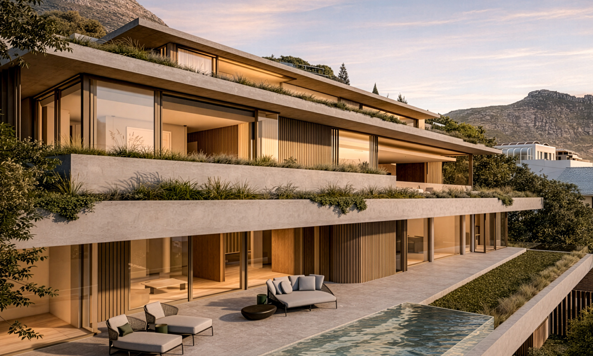 Embedded into the hillside, the architecture descends with the natural gradient in a sequence of layered horizontal planes. Each level extends outward into generous terraces, planted gardens, and green roofs — dissolving the boundary between built form and landscape.