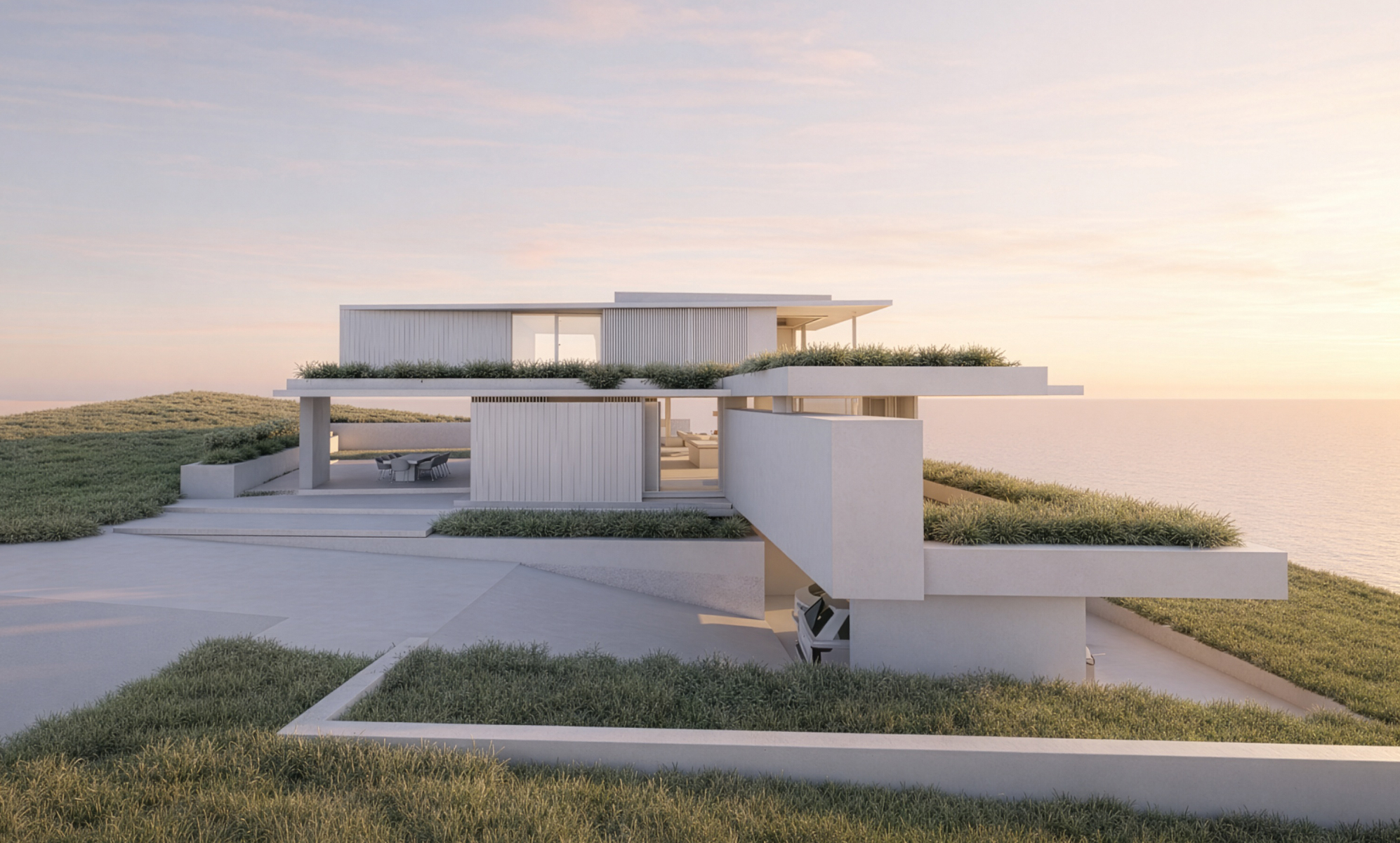 The design negotiates solidity and openness. Deep overhangs provide protection from coastal conditions, while vertical courtyards and planted edges introduce filtered light and natural ventilation deep into the interior. Living spaces unfold seamlessly toward expansive terraces and pool decks, establishing a continuous relationship with sea and sky.